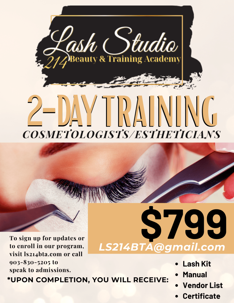 LaCrecia Steward is the owner of Lash Studio 214 Beauty & Training Academy. She opened the academy in October 2020. It is the first private secondary cosmetology School in East Texas. It is the only school in that area that provides eyelash extension training. After attending the training academy, completing the course, and passing the written and practical exams you will be licensed to perform eyelash extensions in the state of Texas.